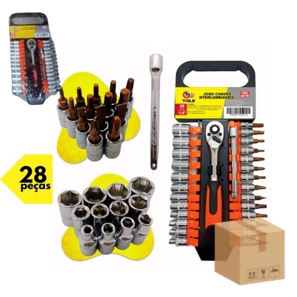 Descrição: Jogo composto por 28 peças - 12 peças soquete 4/ 4.5 / 5 / 6 / 7 / 8 / 9 / 10 / 11 / 12 / 13 / 14 MM