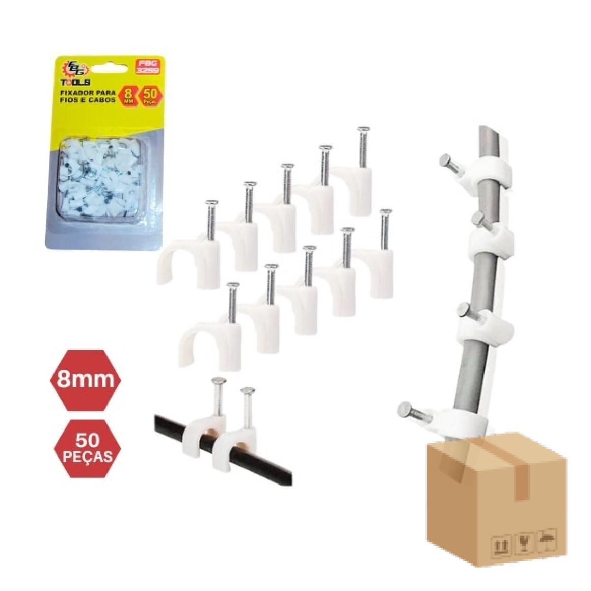 Descrição: Fixador para fio ou cabo, modelo circular de 8mm com prego de aço. Na cor branco, embalagem com 50 peças.